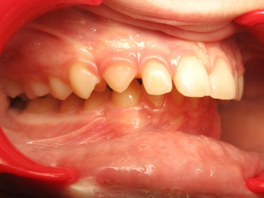 Les arcades dentaires montrent un décalage majeur de classe II, avec des incisives inférieures en position très reculée, venant directement au contact du palais. Cette configuration traduisait un déséquilibre squelettique important entre maxillaire et mandibule. Le traitement a consisté en une préparation orthodontique rigoureuse, suivie d’une chirurgie orthognathique permettant de repositionner les bases osseuses et de restaurer une occlusion fonctionnelle.